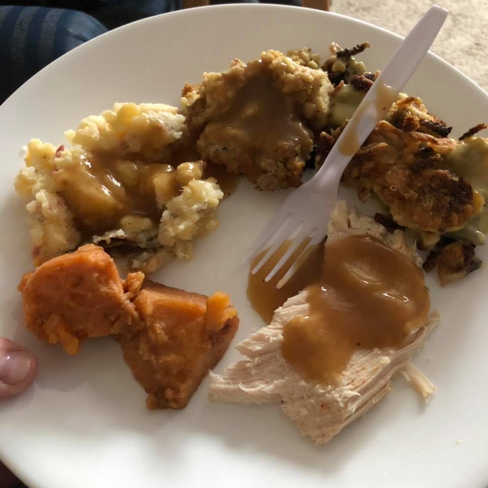 Sweet Potato, Mashed Potato, Stuffing, Green Bean Casserole, Turkey and Gravy